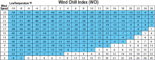 Extreme cold and wind conditions exist when the wind chill is below 0ºF.